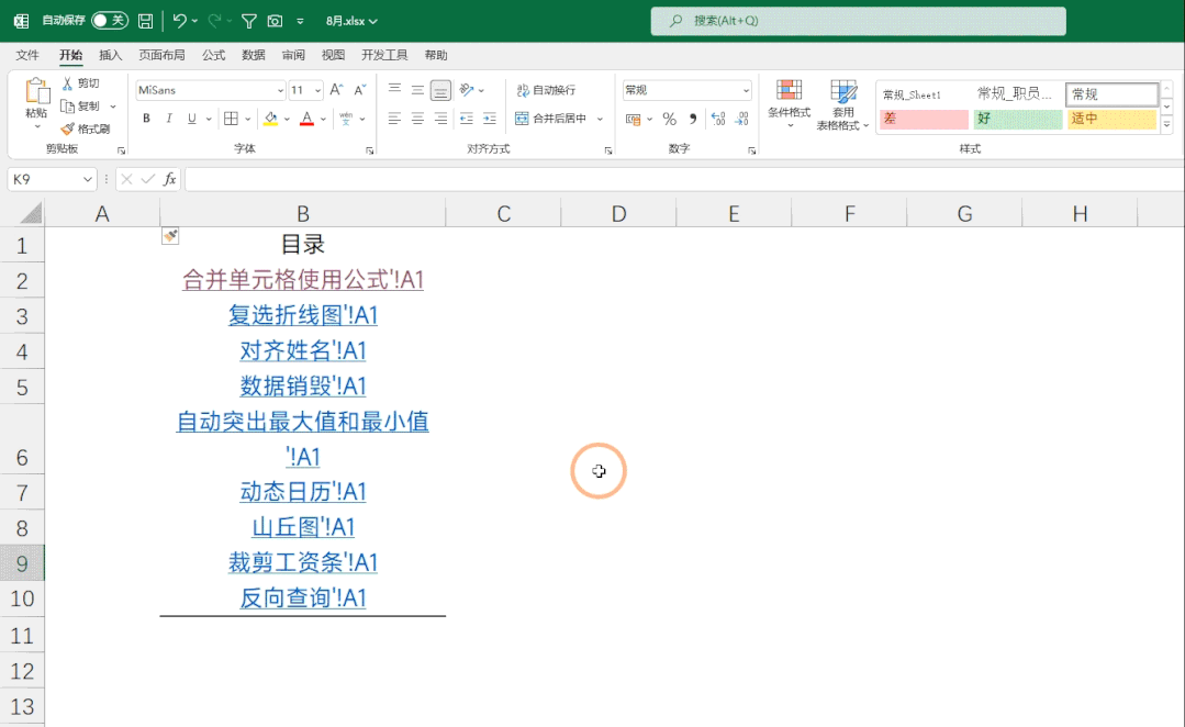 随后我们仅仅保留【sheet名称'!A1】这个区域,将不需要的区域全部删除即可。至此就制作了一个简单的Excel目录,如果你需要求不高,可以用就行,做到这里就可以结束了。如果要求比较高,就需要再美化下