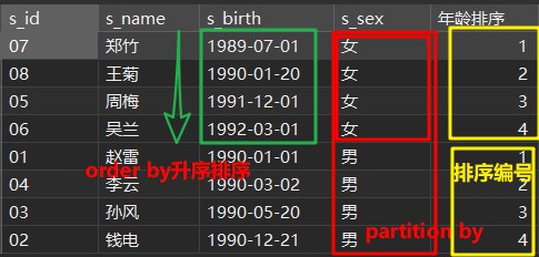 row_number() over ( PARTITION BY s_sex ORDER BY s_birth ) AS 年龄排序 ,