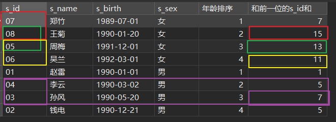 sum(s_id) over(partition by s_sex order by s_birth rows between 1 preceding and current row) as 和前一位的s_id和