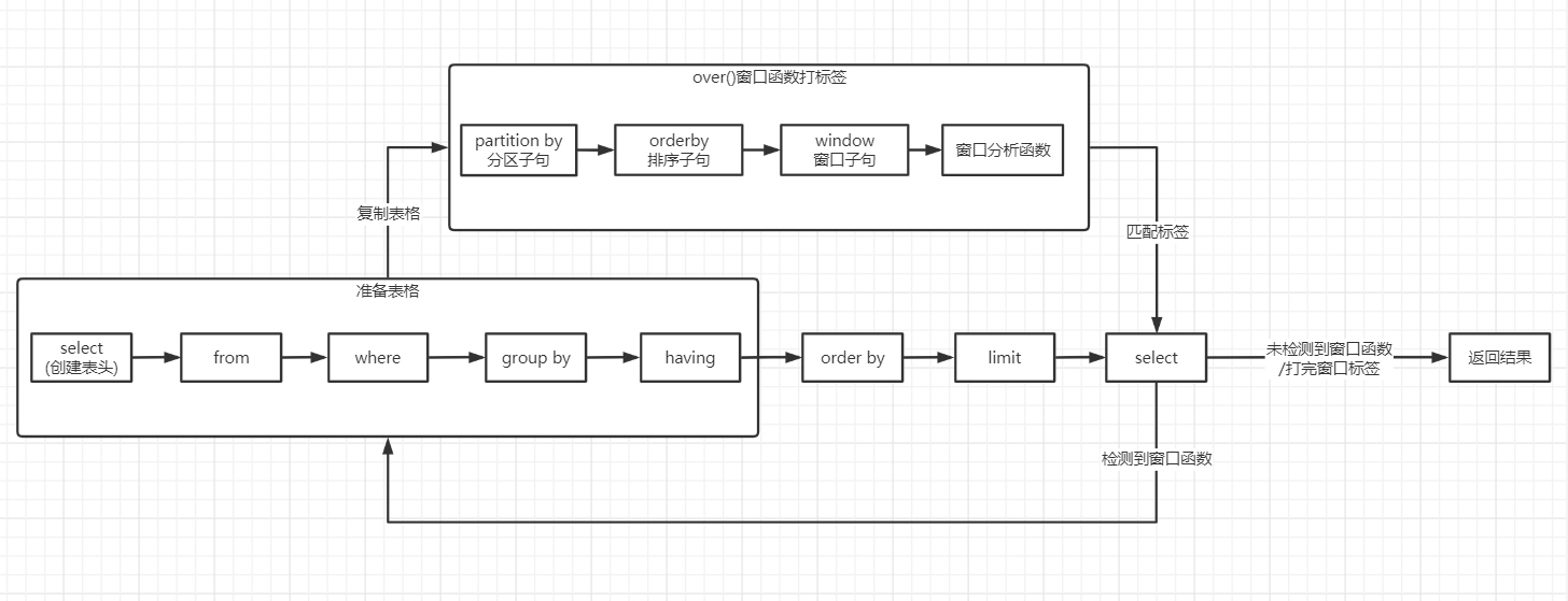 正常没有窗口函数的情况下就是一条直线,当碰到窗口函数的时候会复制一份having后的数据,然后通过再进行窗口函数处理后匹配到表头里,再返回通过order by -> limit -> ...