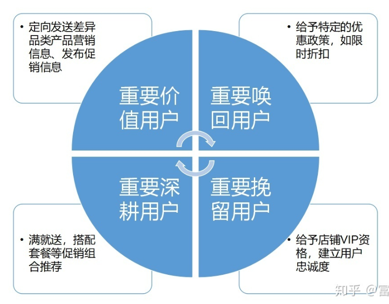 重要挽留客户(001):最近消费时间较远、消费频次不高,但消费金额高的用户,可能是将要流失或者已经要流失的用户,应当给予挽留措施措施
