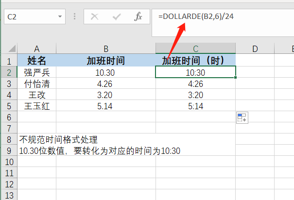 << excel函数之DOLLARDE-数值转换 作者:YXN-Excel 阅读量:363 发布日期:2022-10-01 DOLLARDE函数的功能是【将以分数表示的货币值转换为以小数表示的货币值】, 但是这话到底是什么意思呢?翻译过来就是:数值=整数部分+小数部分/进制, 举个例子:比如加班时间的转换,原来是用“10.30”这样的不规范的格式,如果要统一转换为“10:30”,公式为=DOLLARDE(B2,6)/24 YXN-Excel 2022-10-01 上一篇:excel函数之FORMULATEXT-提取公式 下一篇:excel函数之CONVERT-单位换算
