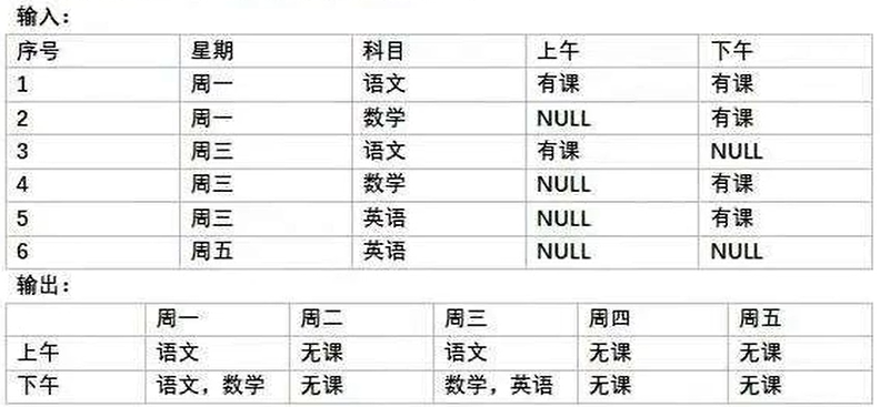 思路:先找出上午的课和下午的课组成一个表,再通过case when进行行列转置